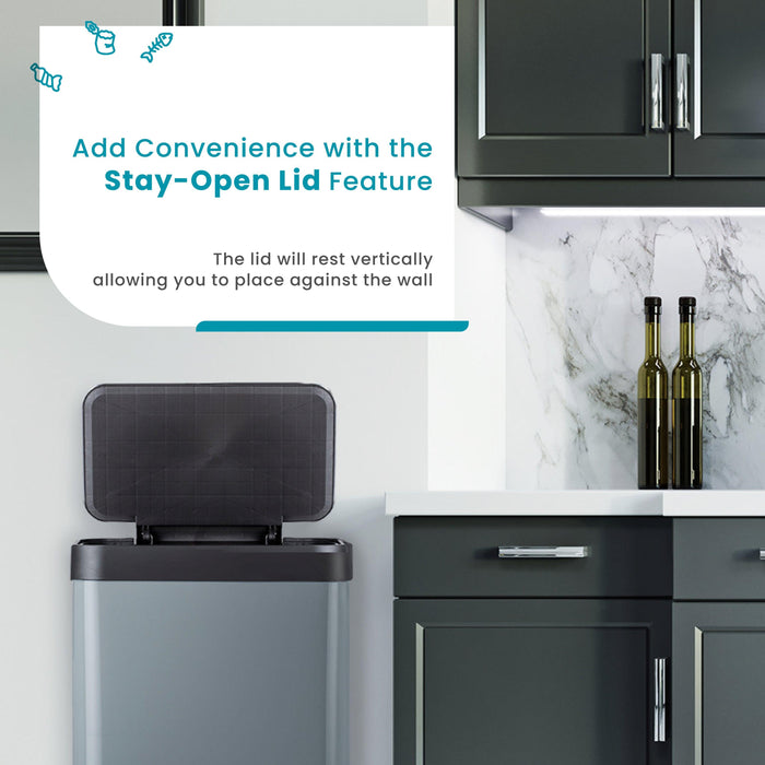 - Keep Bags Secure – Two iron wire holders will help prevent any bags from falling through. To use, gently push the lid back to keep it open, lift the two iron wires up, wrap the bag around both sides, and place back in place